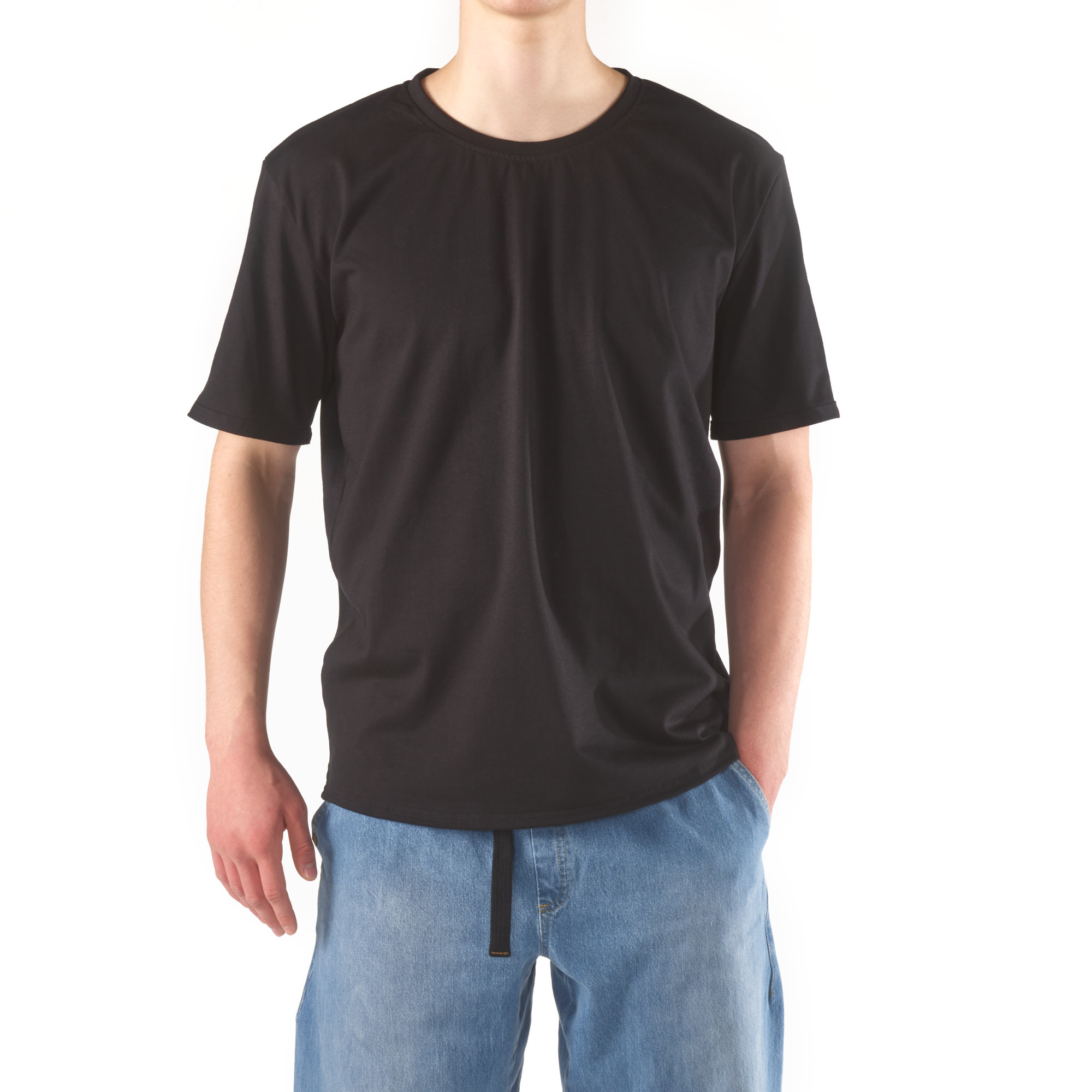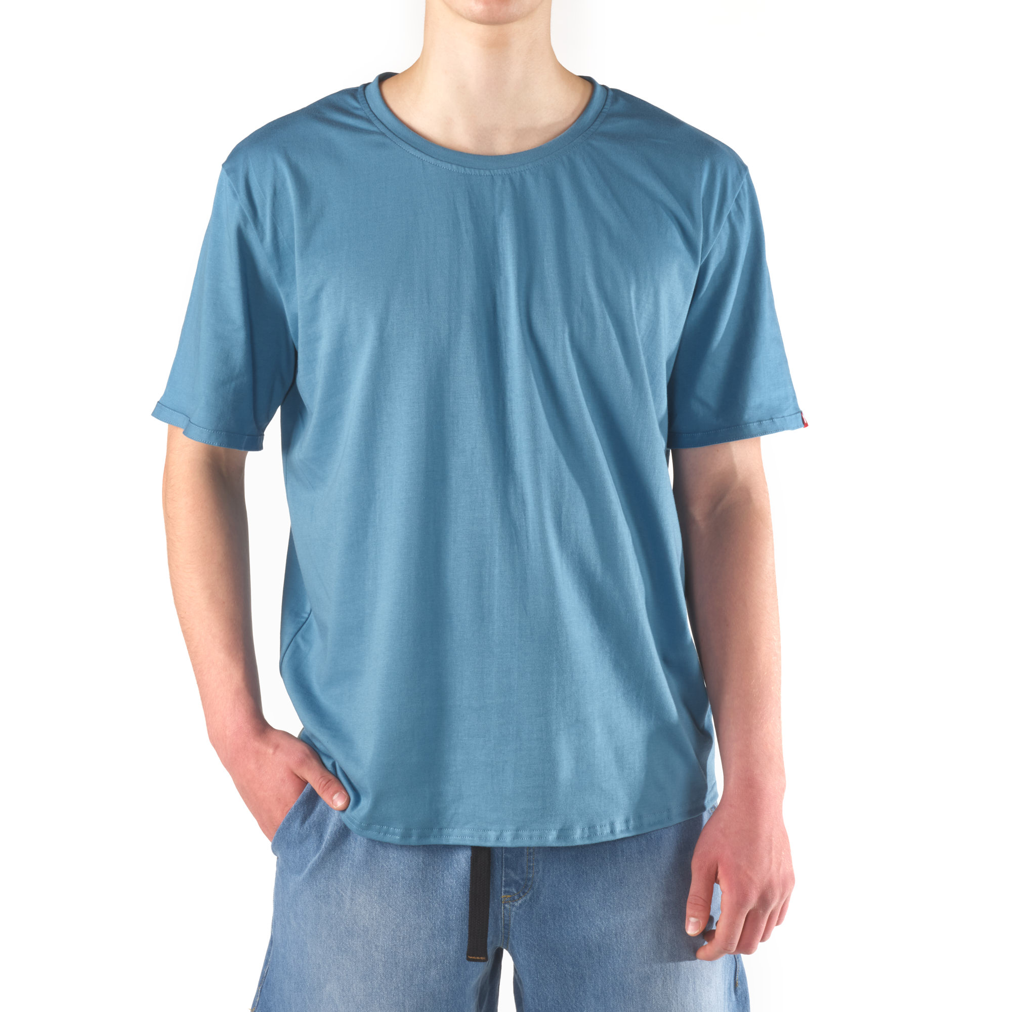 The back is slightly extended to keep everything covered when you bend forward. The cut narrows gently towards the hem, so the shirt doesn’t flare around the waist and sits cleaner on the body.